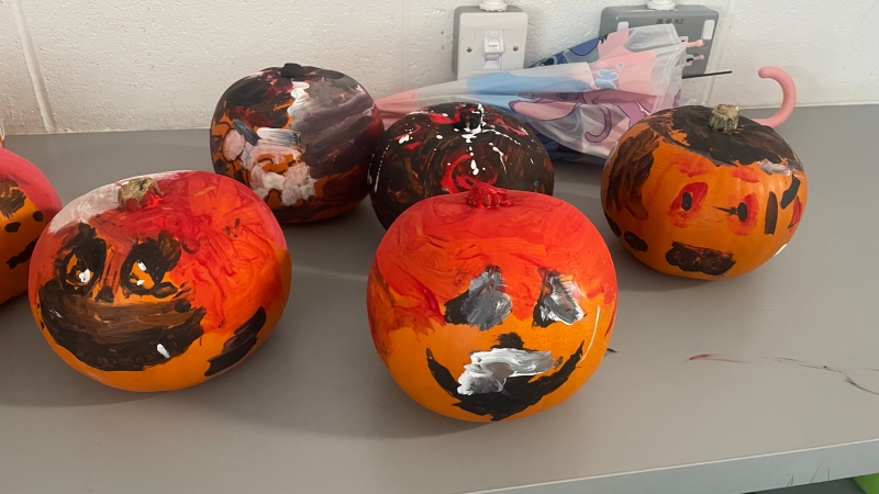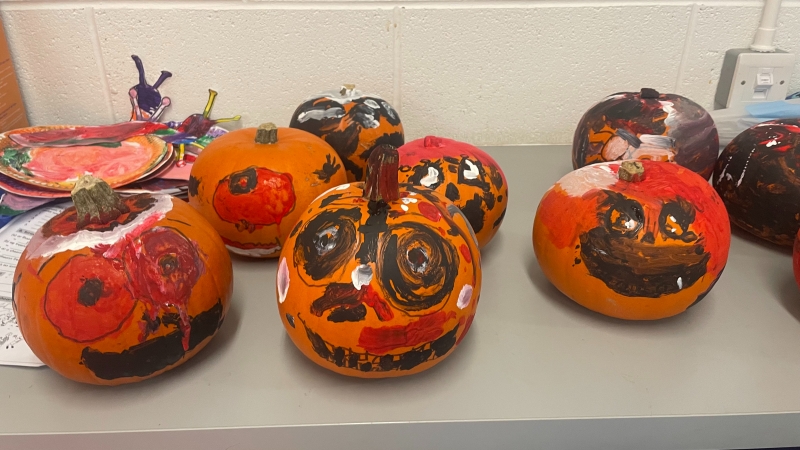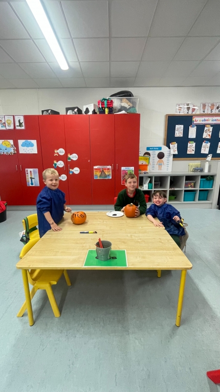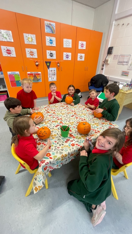 Tháinig ár gcairde ó rang a 5 síos chun cabhrú leis na Naíonáin Shóisearacha lena n-ealaín Oíche Shamhna! D’oibrigh siad le chéile ag péinteáil puimcíní ildaite, ag gáire agus ag léiriú cairdis agus cruthaitheachta iontach.