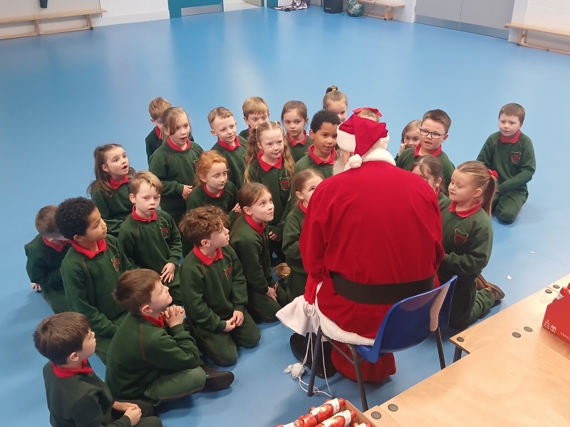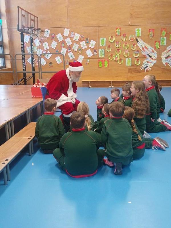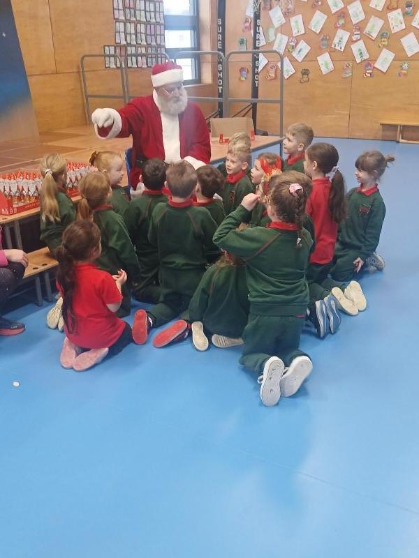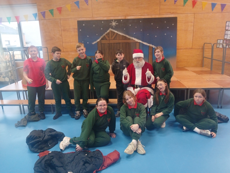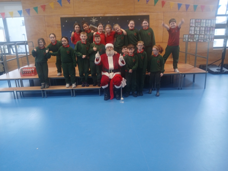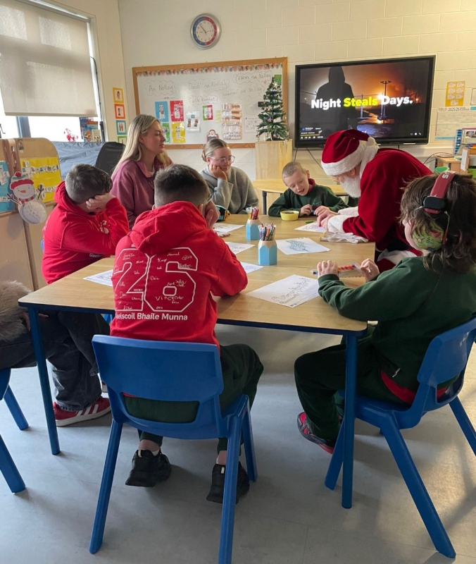 Tháinig Daidí na Nollag ar chuairt go Gaelscoil Bhaile Munna inniu. Labhair sé le gach rang. Chan na páistí amhráin dóibh agus chuir siad go leor ceisteanna air. Bhí na páistí an sásta leia an seacláid a thug sé dóibh.